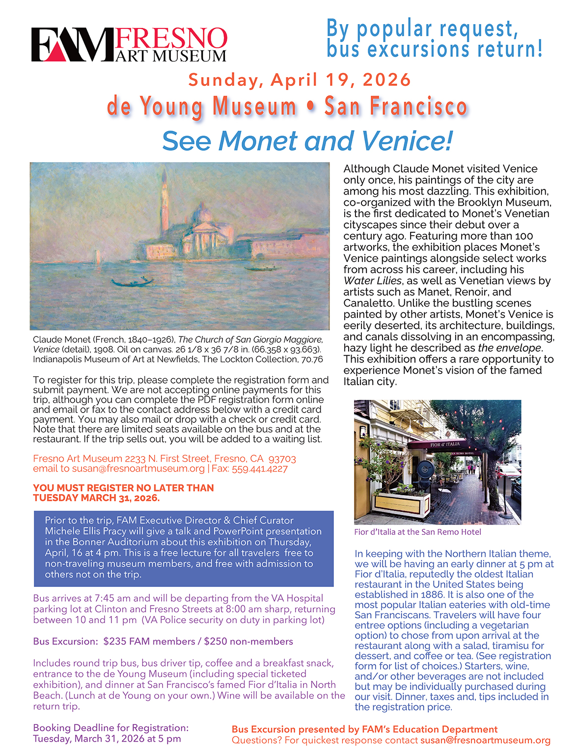 FAM occasionally schedules bus trips to other museum venues in the Bay Area, Greater Los Angeles area, Sacramento, and other venues in California. Watch here for the next one!