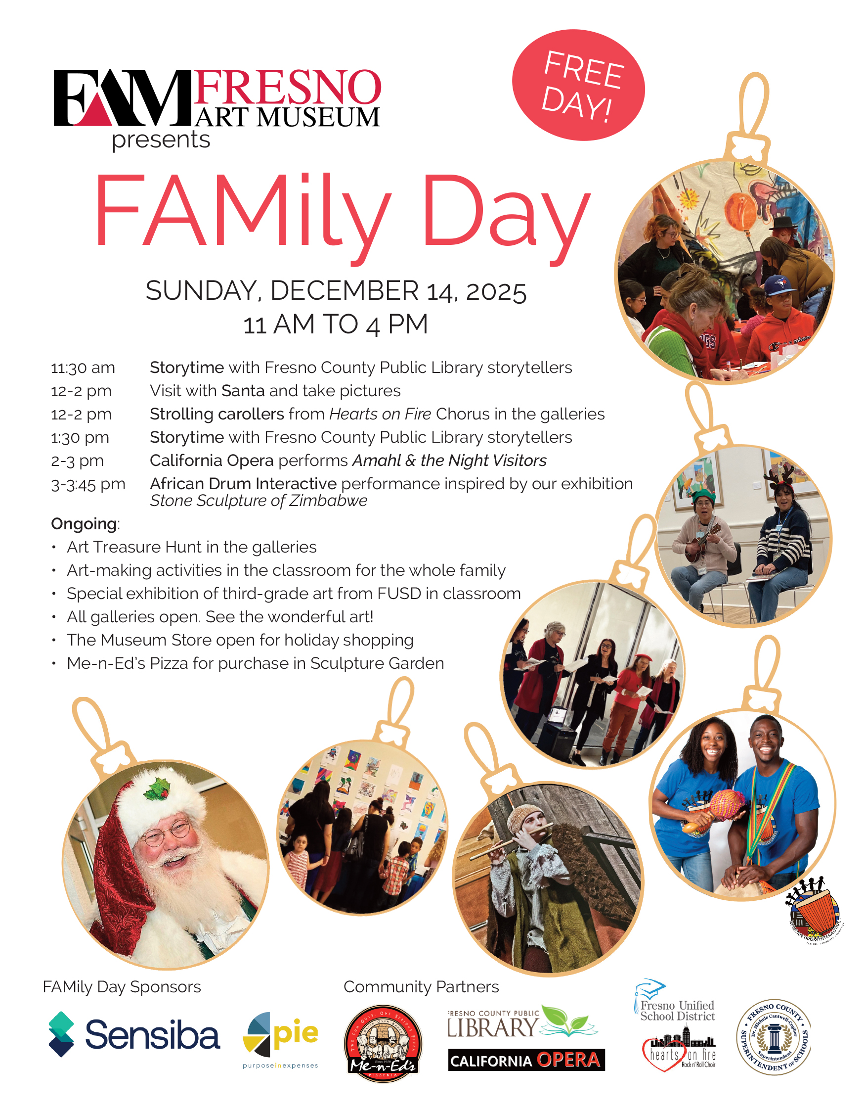 It's a day at the Museum where families are invited to explore the galleries on their own, go on an art treasure hunt for a prize for the children, and create art with our teaching artist staff in our classroom. We also often have storytime with the Fresno County Public Library and have musical guests or other performers entertain. During the December FAMily Day, we always have a visit from Mr. & Mrs. Claus for a great picture opportunity. We also like to have family-friendly food available for purchase.
